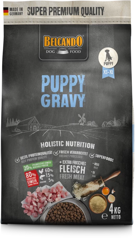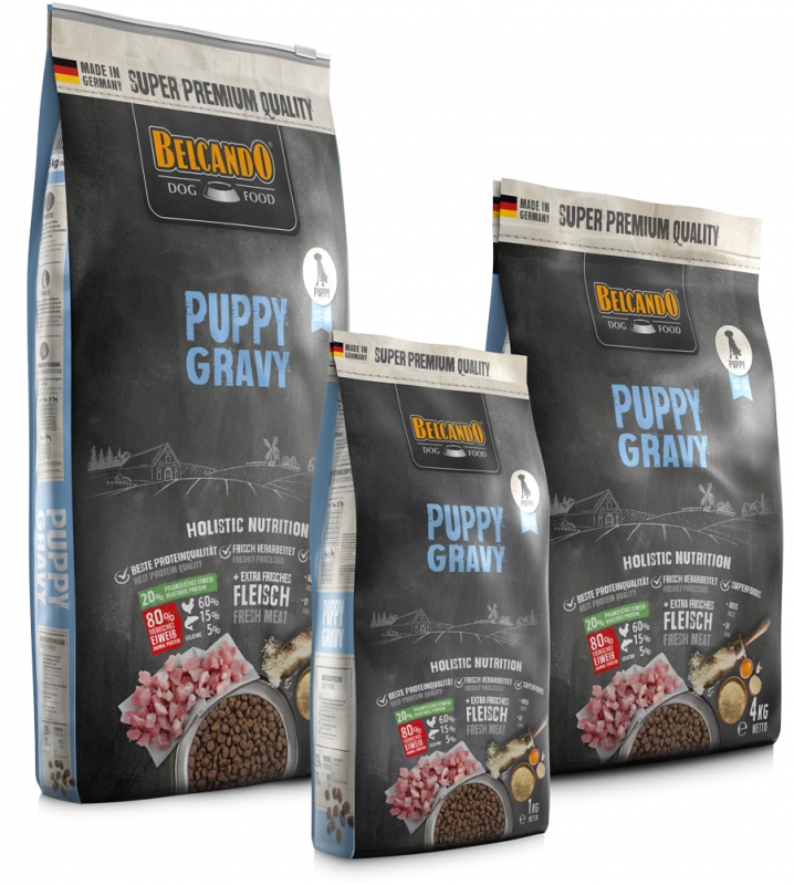 Zur Erleichterung der Anfütterung wurde BELCANDO® Puppy gravy mit einer speziellen Sauce ausgestattet. Unter sorgfältigem Anrühren von 3 Teilen BELCANDO® Puppy gravy mit 1 Teil warmem Wasser (40-50 °C) bildet sich ein besonders schmackhafter Soßenüberzug über den Futterpartikeln. Dieser regt die Welpen zur Futteraufnahme an. Später kann BELCANDO® Puppy gravy bei Bedarf auch trocken verfüttert werden. Im Laufe des 4. Monats wird empfohlen, langsam auf BELCANDO® Junior umzustellen.
